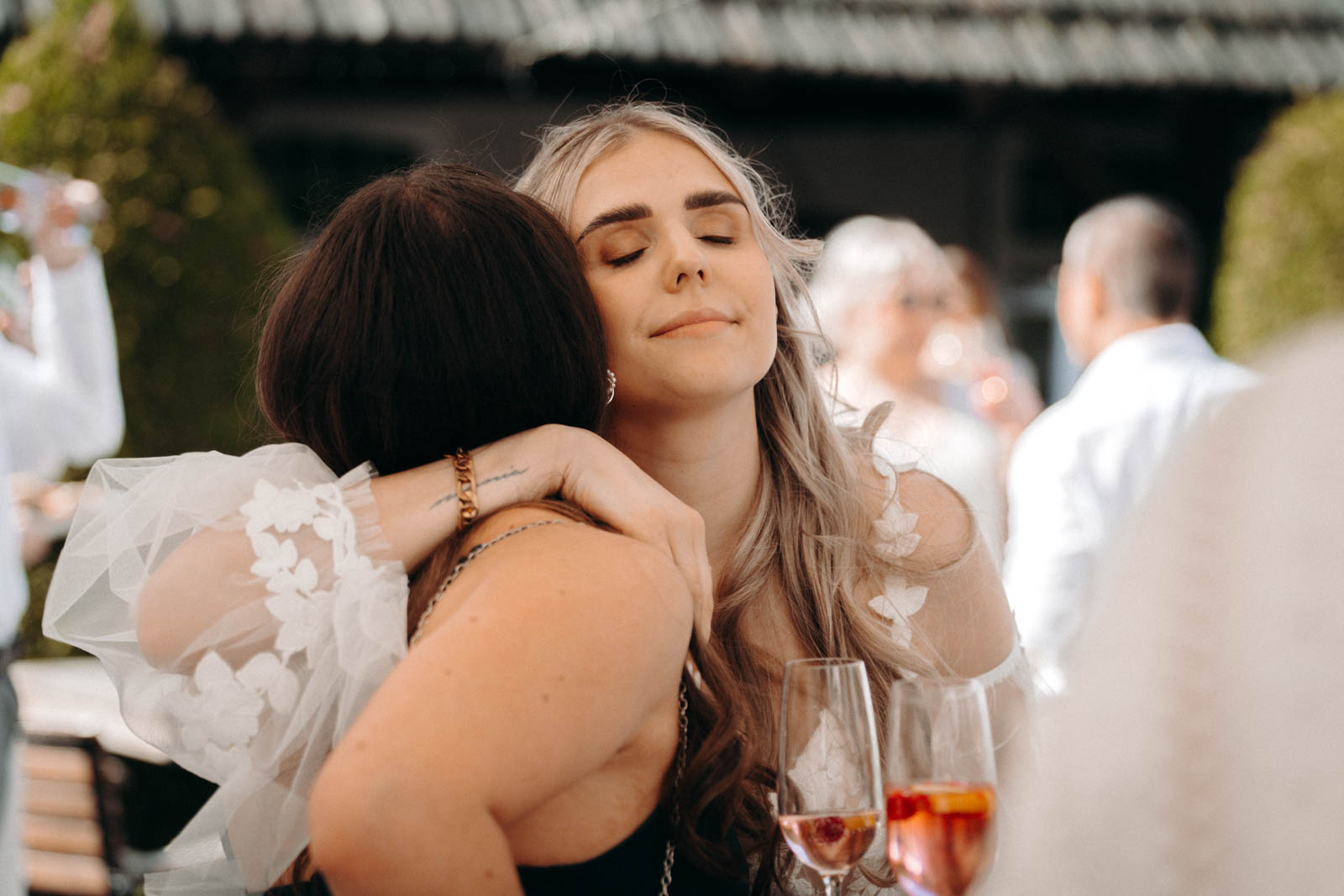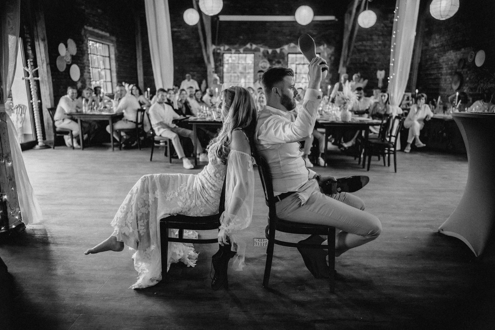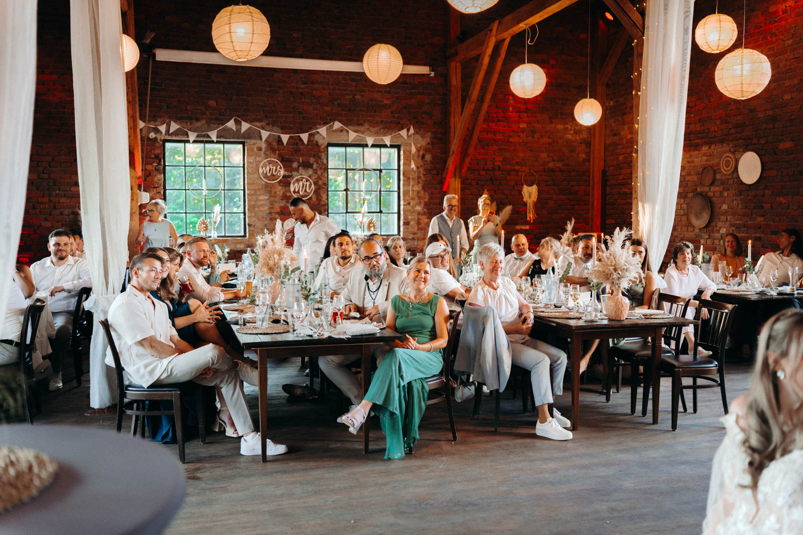 Die Hochzeit im Einhaus Möttau ist nicht nur für das Brautpaar, sondern auch für die Gäste ein besonderes Erlebnis. Die entspannte Atmosphäre, die ländliche Idylle und der historische Charme sorgen dafür, dass sich alle wohlfühlen und den Tag in vollen Zügen genießen können. Im Außenbereich können die Gäste entspannen, während sie die Natur und die frische Luft genießen, und am Abend verleiht sanftes Licht dem Einhaus eine romantische und festliche Stimmung. Die gemütliche Atmosphäre im Festsaal und die natürlichen Materialien im Innenbereich schaffen ein warmes Ambiente, das die Gäste willkommen heißt und zum Feiern einlädt.