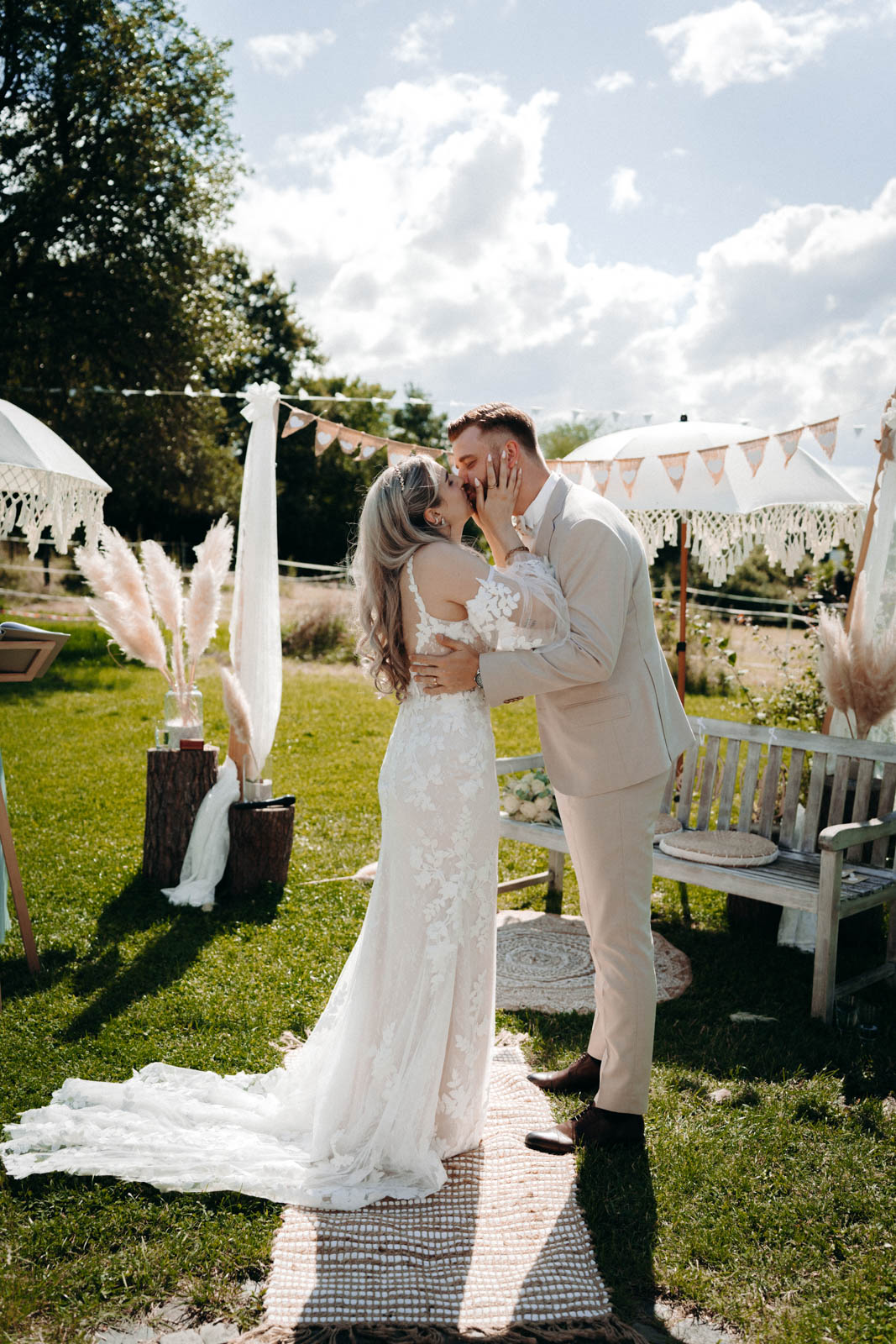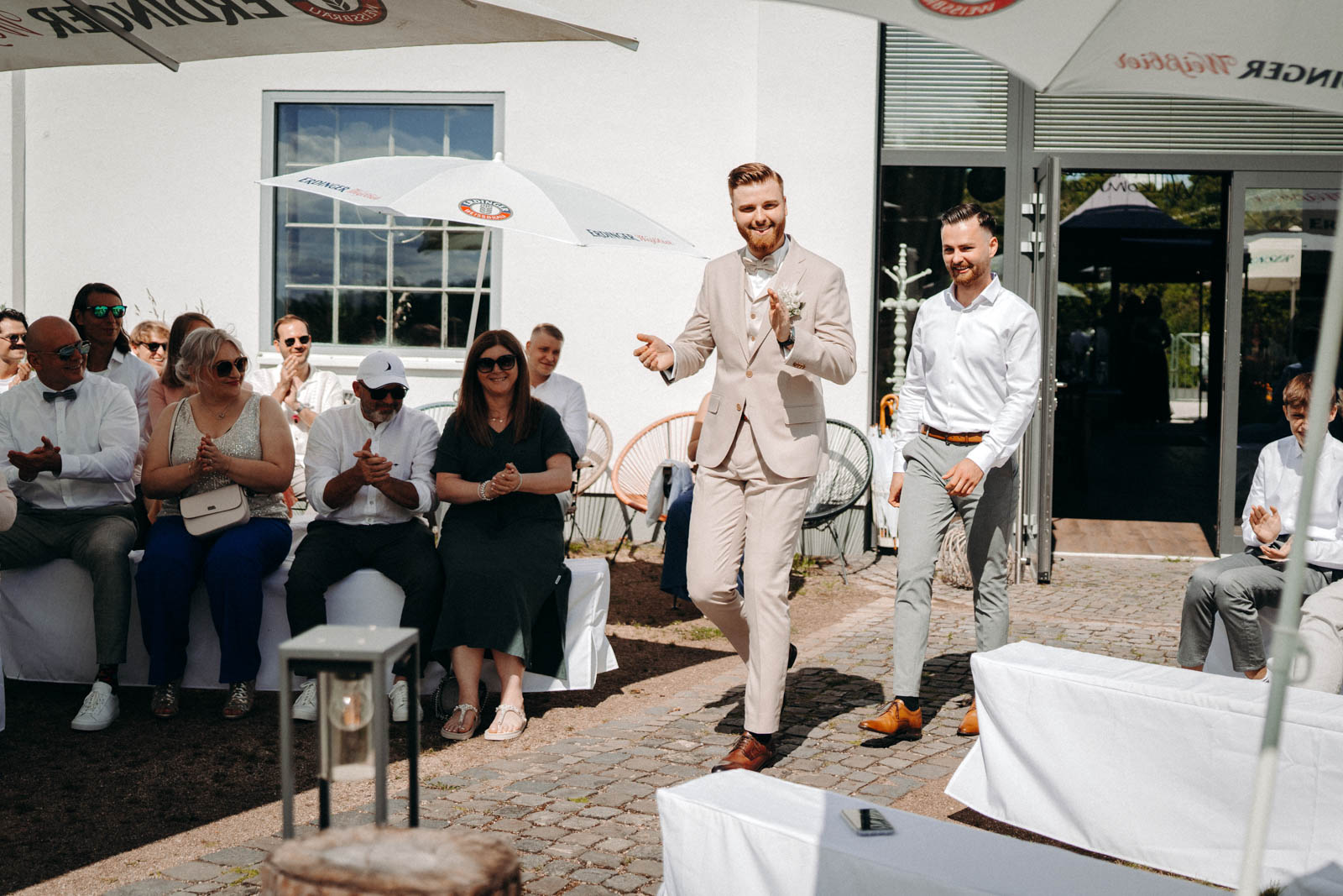 Das Einhaus, ein liebevoll restauriertes Fachwerkgebäude, versprüht historischen Charme und bringt die Gäste sofort in eine heimelige, warme Stimmung. Viele Paare entscheiden sich für eine freie Trauung im schönen Außenbereich, der von Grünflächen und schattenspendenden Bäumen umrahmt ist. Diese naturverbundene Atmosphäre eignet sich hervorragend für eine Trauung unter freiem Himmel, die sowohl romantisch als auch entspannt ist. Der rustikale Außenbereich lässt sich individuell gestalten, sei es mit Blumenarrangements, rustikalen Holzdetails oder eleganten Lichtern – perfekt, um eine persönliche und einzigartige Zeremonie zu gestalten.
