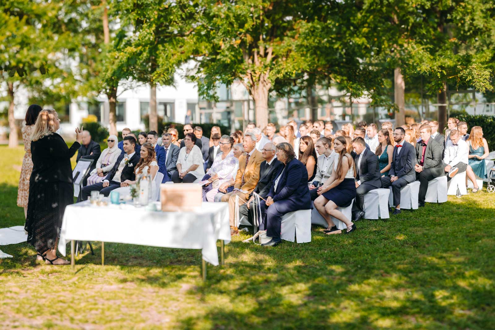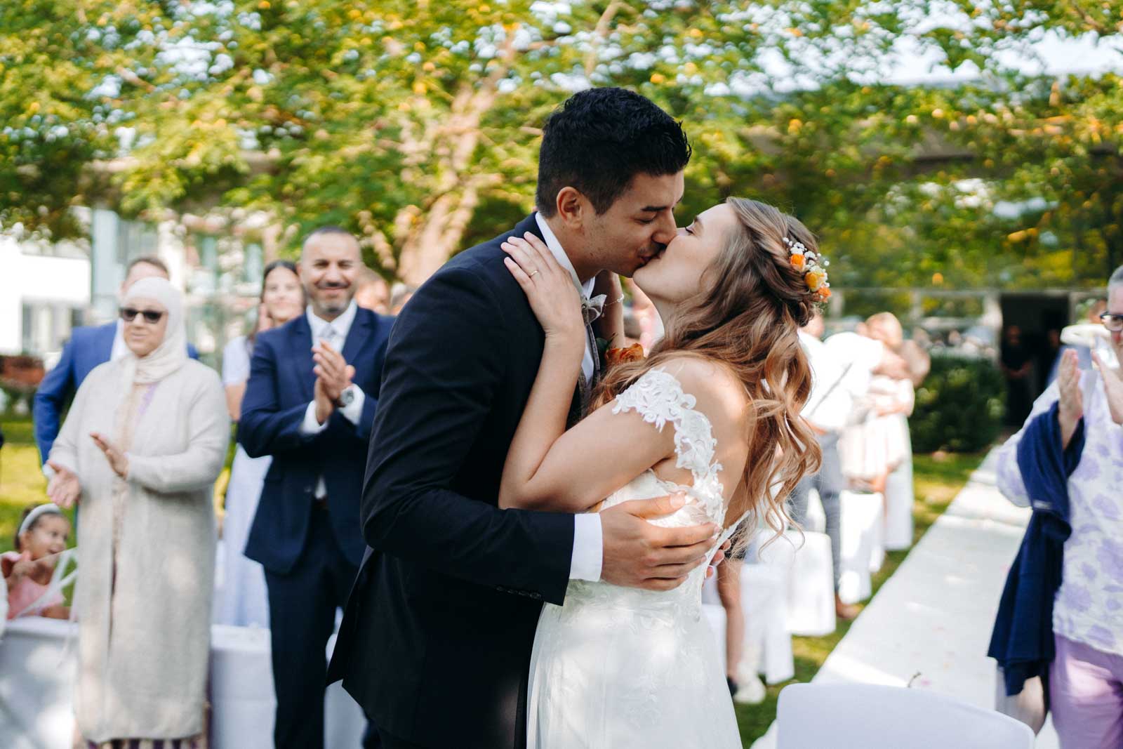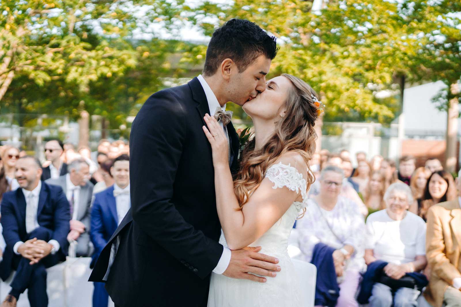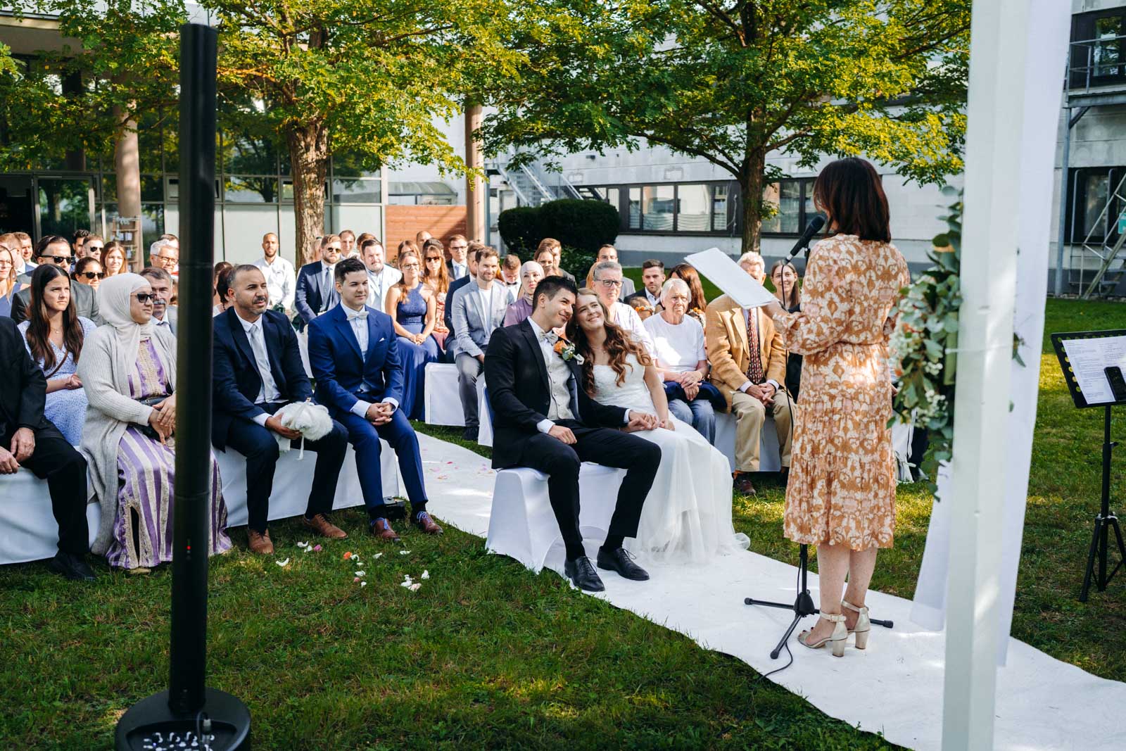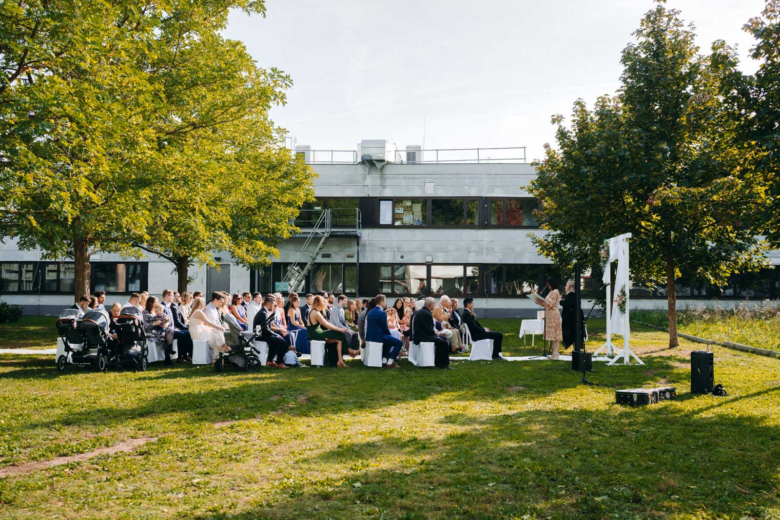 Die Eventlocation verfügt über einen malerischen Außenbereich, der sich ideal für romantische Hochzeitszeremonien und Fotoshootings eignet. Umgeben von Grünflächen und modernen Architekturelementen bietet dieser Bereich die perfekte Kulisse für unvergessliche Momente.