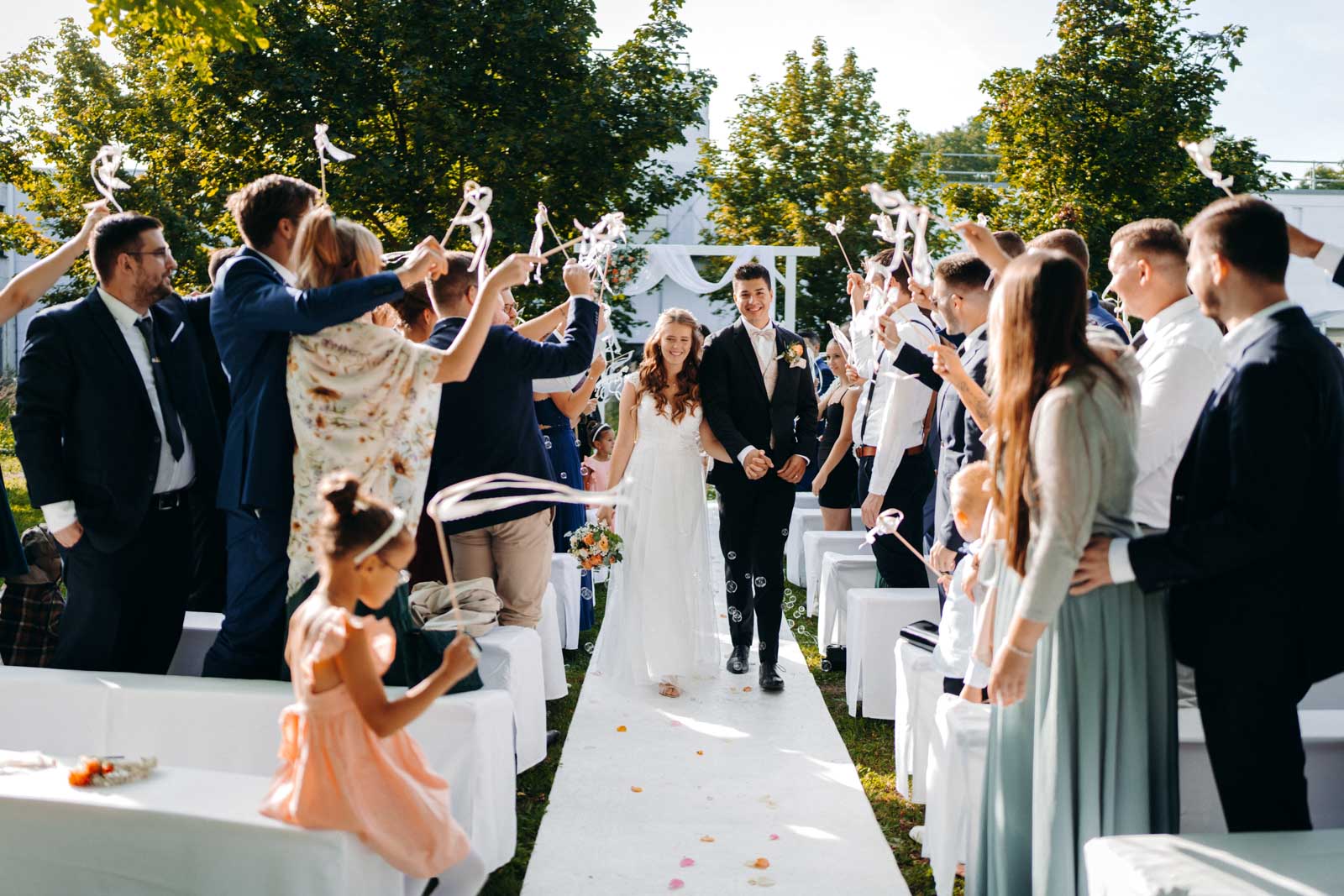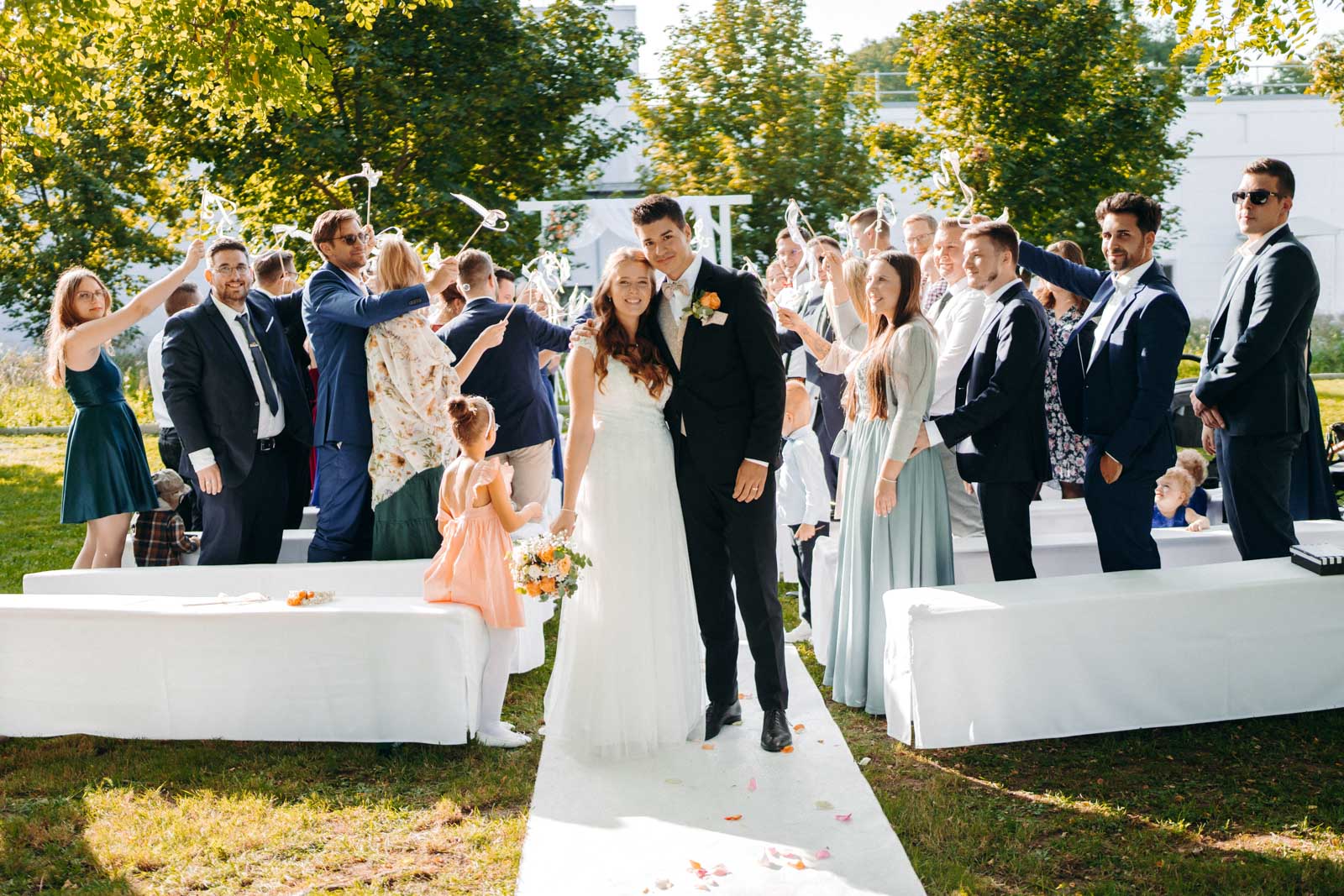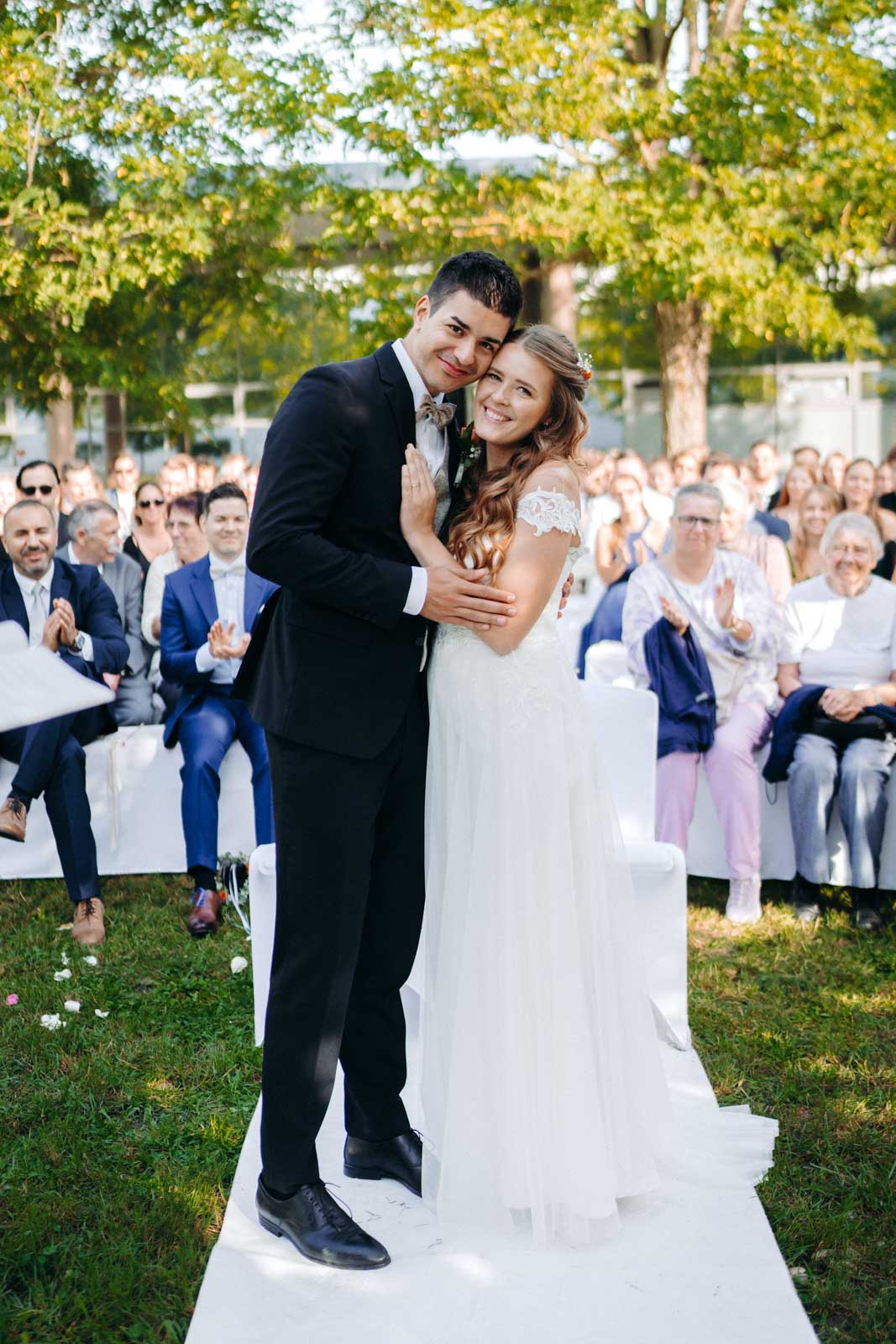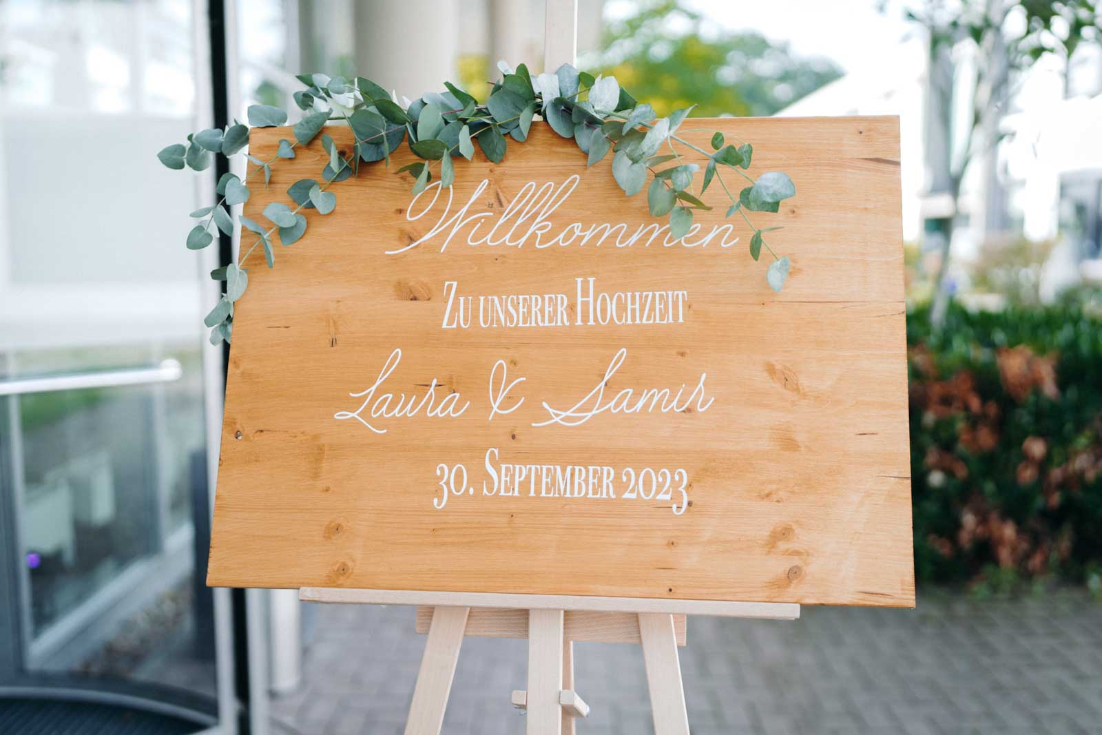 Die Eventlocation verfügt über einen malerischen Außenbereich, der sich ideal für romantische Hochzeitszeremonien und Fotoshootings eignet. Umgeben von Grünflächen und modernen Architekturelementen bietet dieser Bereich die perfekte Kulisse für unvergessliche Momente.