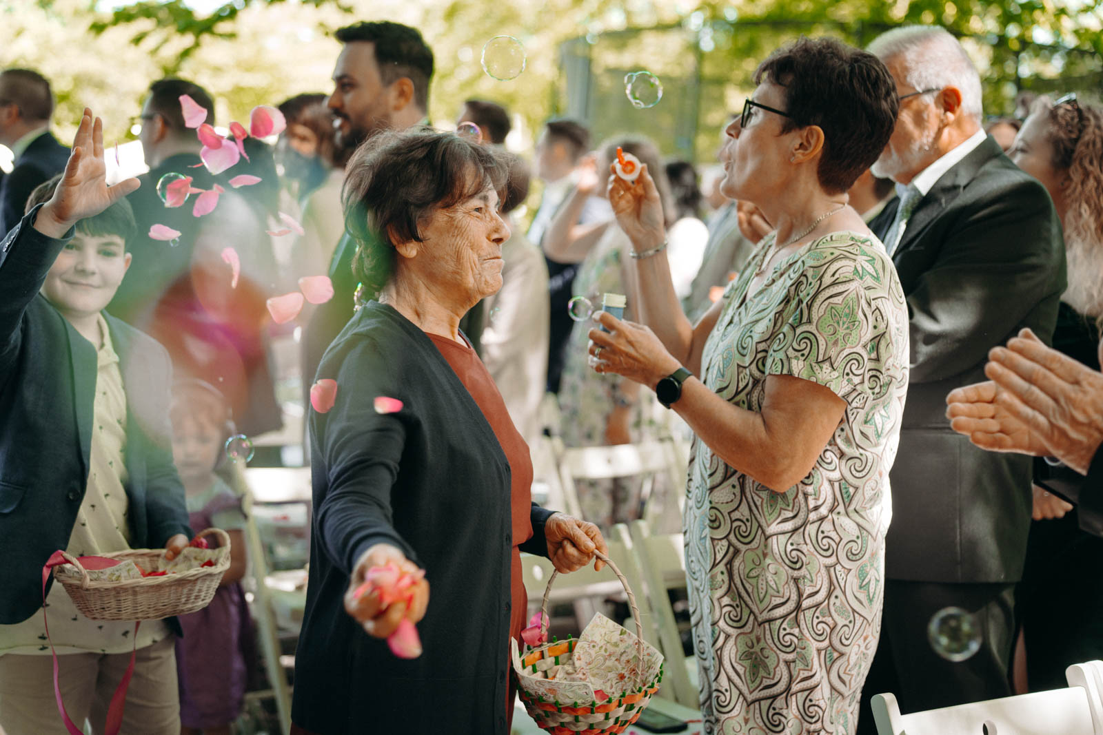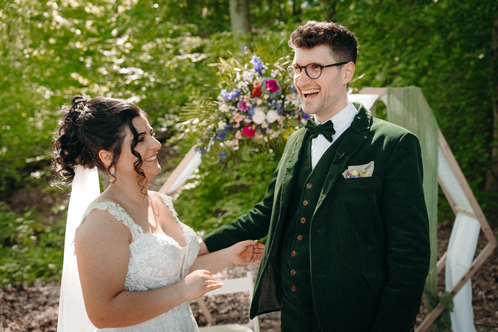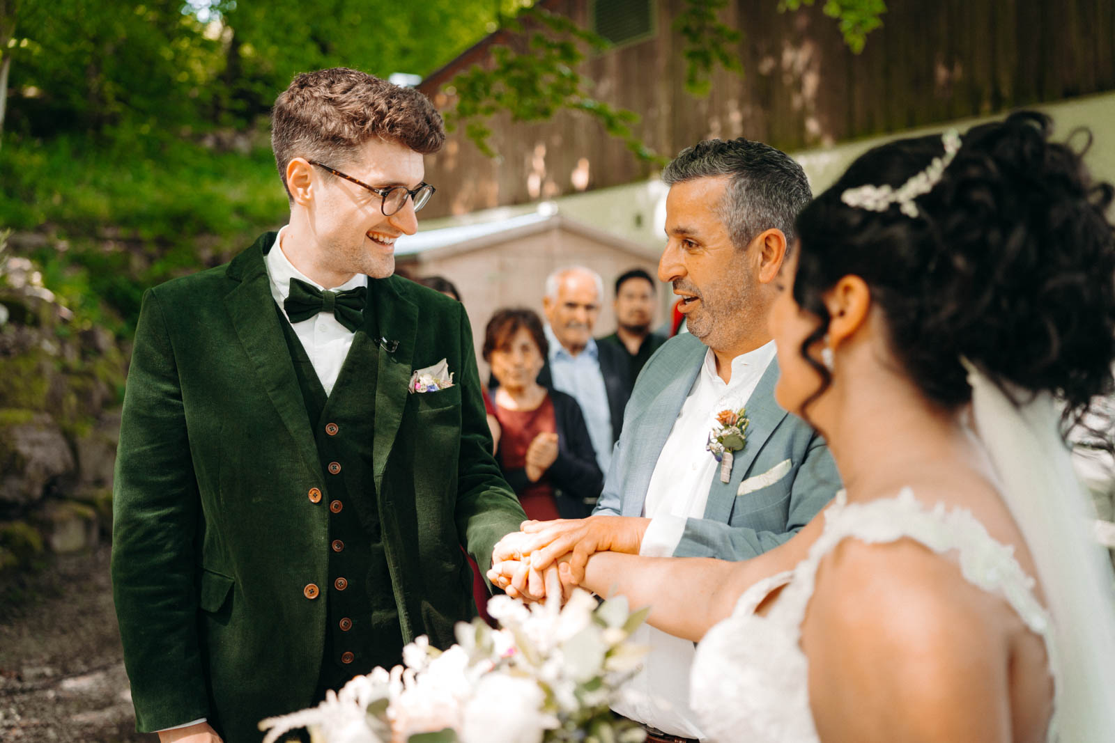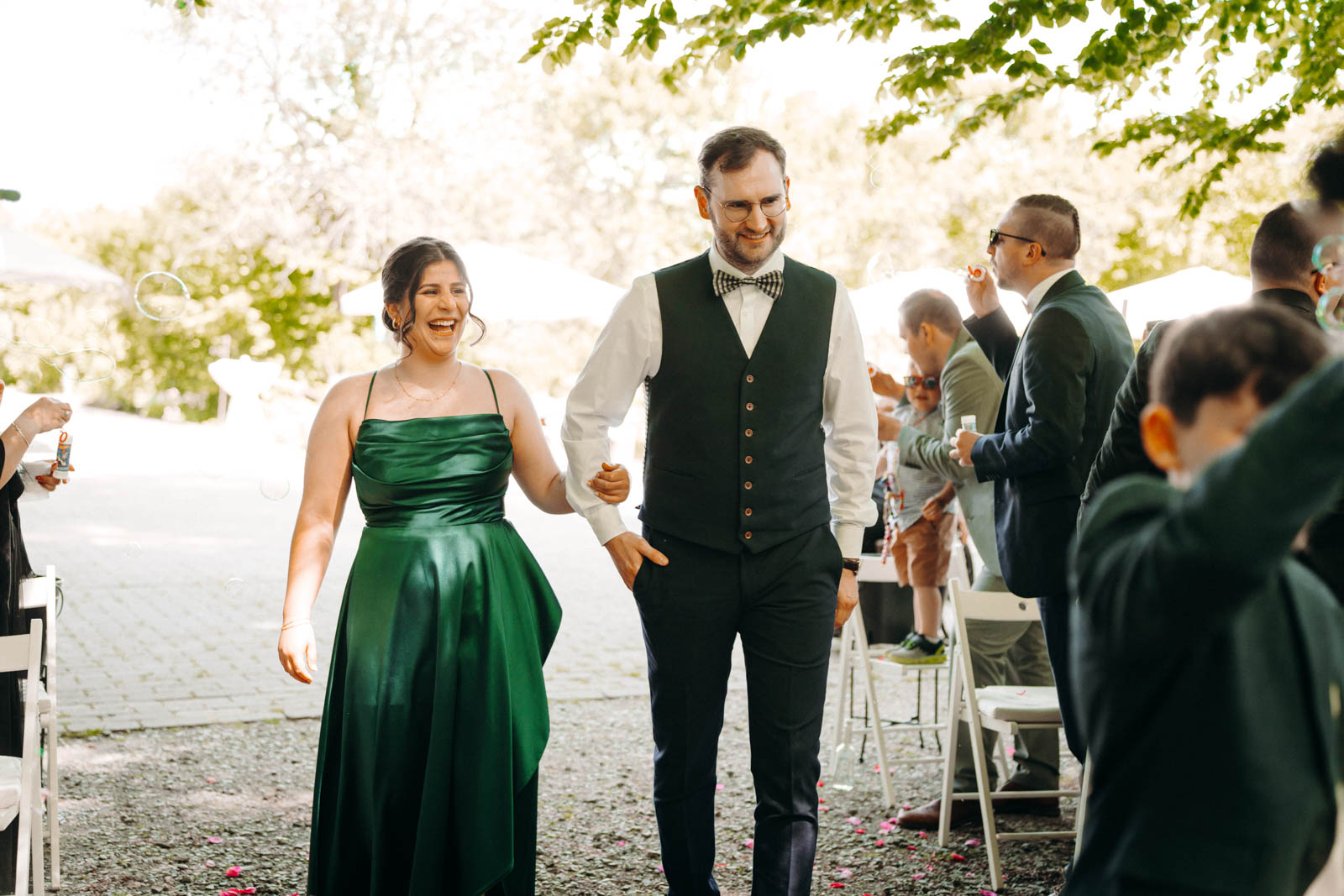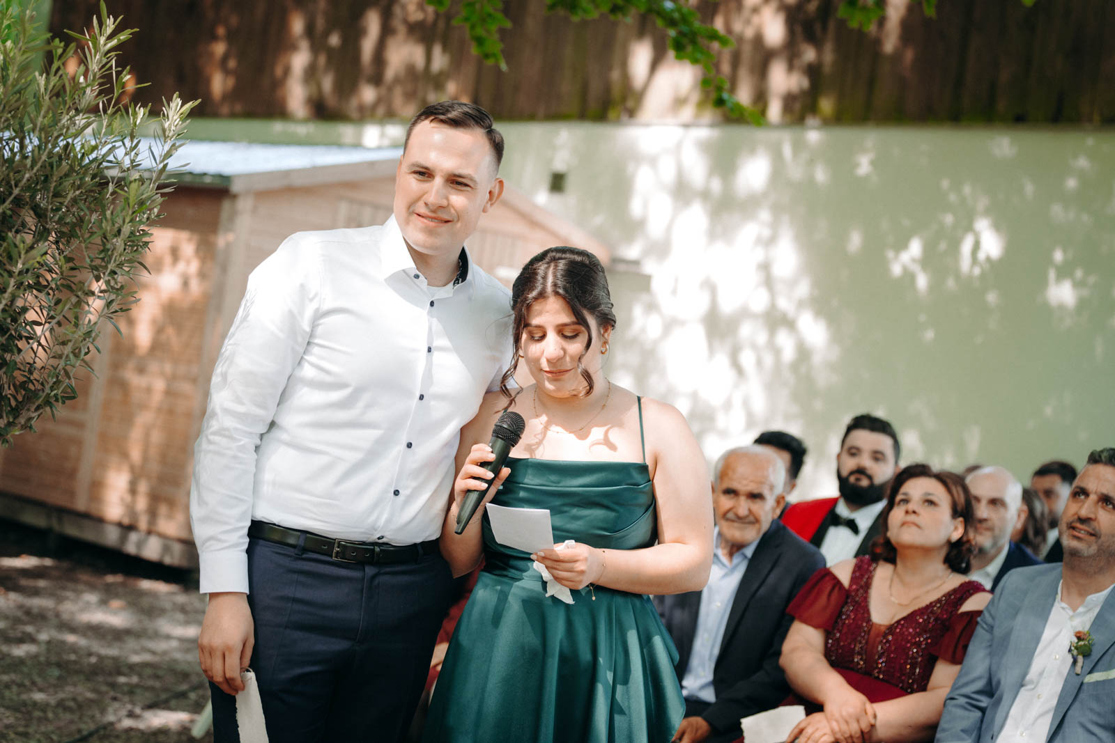 Das Highlight der Trauung von Selda und Konstantin war die Zeremonie, die unter dem großen Baum im Garten der Villa stattfand. Der majestätische Baum bot nicht nur eine malerische Kulisse, sondern symbolisierte auch Stärke, Beständigkeit und das tiefe Wurzelnschlagen, das Selda und Konstantin in ihrer Beziehung verbinden wollte. Der Baum, umgeben von üppigem Grün und blühenden Wiesen, verlieh der Trauung einen besonders magischen Touch. Die Atmosphäre war ruhig, naturverbunden und voller Bedeutung. Umgeben von Familie und Freunden sprachen Selda und Konstantin hier ihre Eheversprechen und gaben sich das Ja-Wort – ein Moment voller Emotionen und Liebe, den die Hochzeitsfotografin perfekt einfangen konnte.