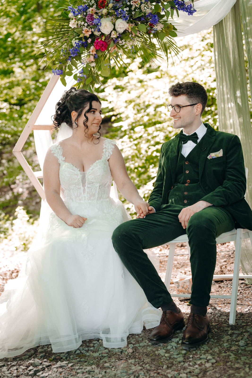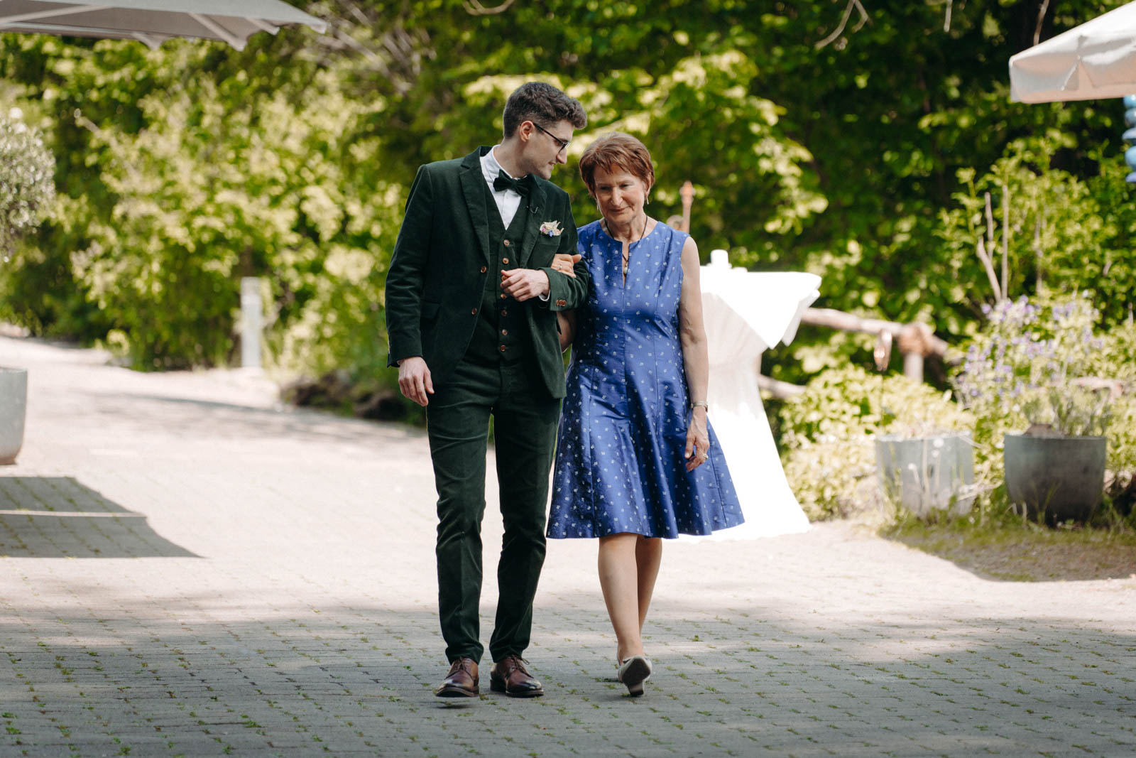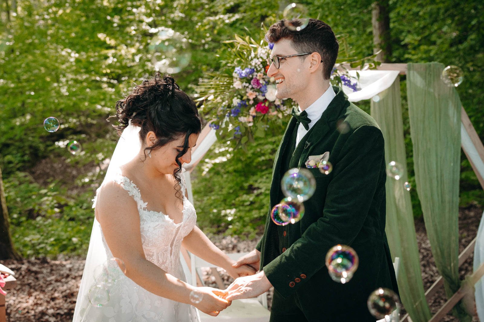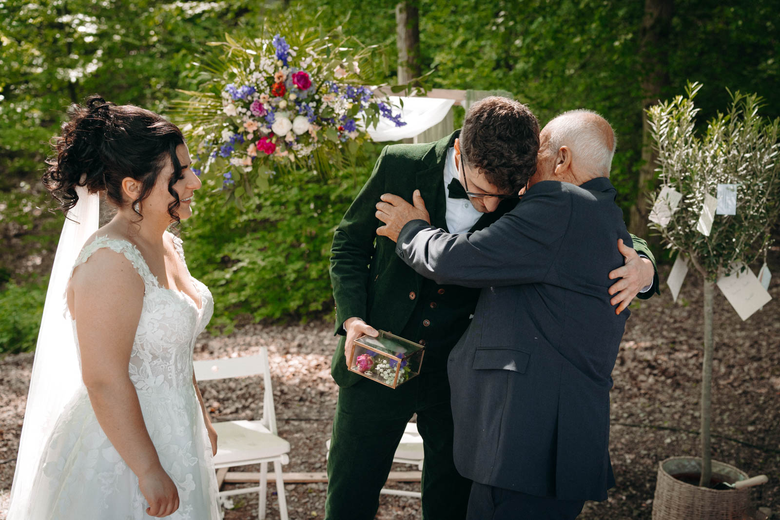 Das Highlight der Trauung von Selda und Konstantin war die Zeremonie, die unter dem großen Baum im Garten der Villa stattfand. Der majestätische Baum bot nicht nur eine malerische Kulisse, sondern symbolisierte auch Stärke, Beständigkeit und das tiefe Wurzelnschlagen, das Selda und Konstantin in ihrer Beziehung verbinden wollte. Der Baum, umgeben von üppigem Grün und blühenden Wiesen, verlieh der Trauung einen besonders magischen Touch. Die Atmosphäre war ruhig, naturverbunden und voller Bedeutung. Umgeben von Familie und Freunden sprachen Selda und Konstantin hier ihre Eheversprechen und gaben sich das Ja-Wort – ein Moment voller Emotionen und Liebe, den die Hochzeitsfotografin perfekt einfangen konnte.