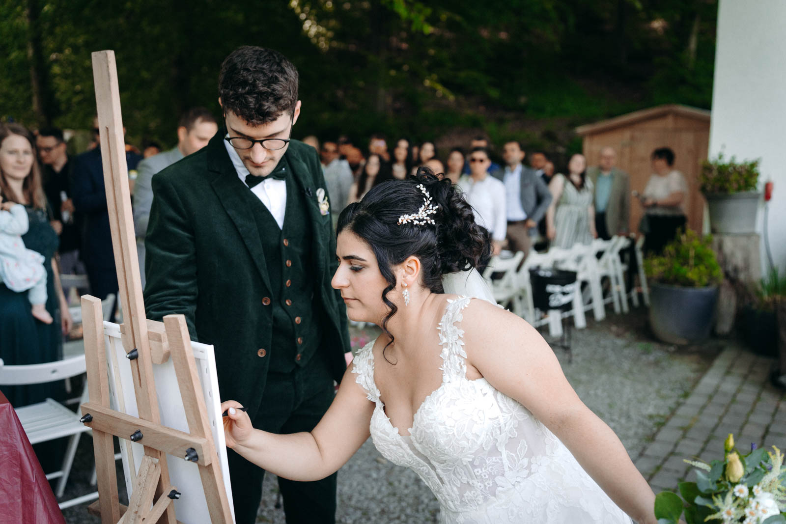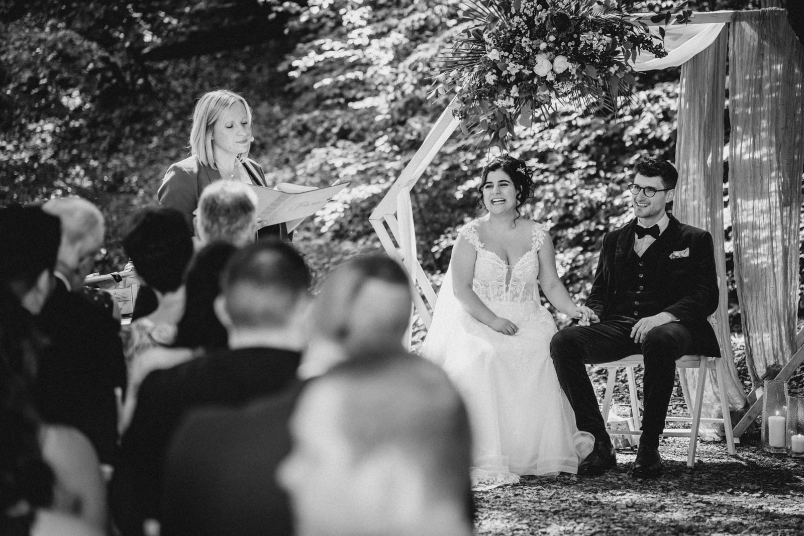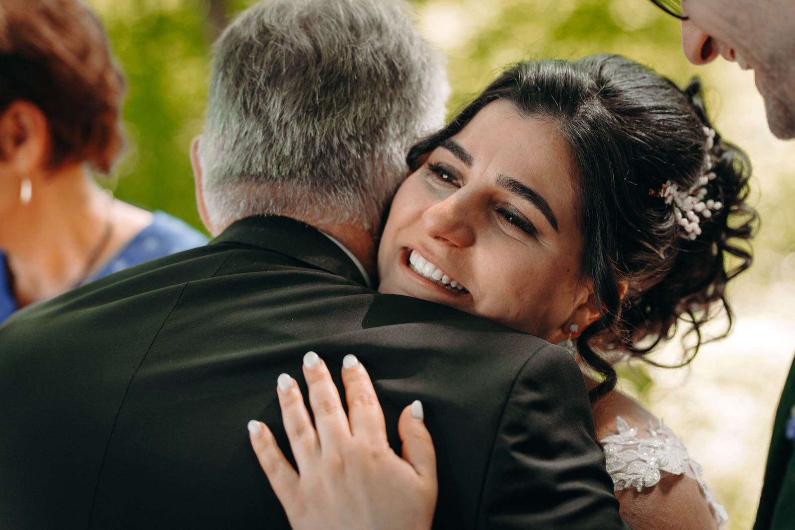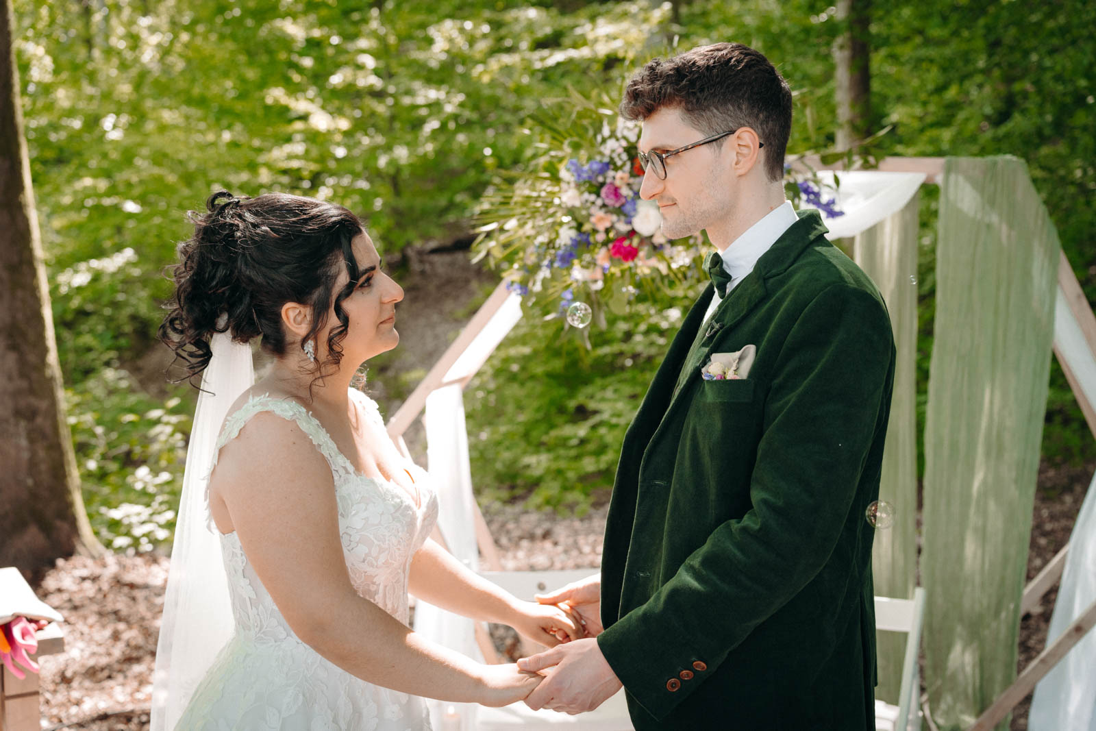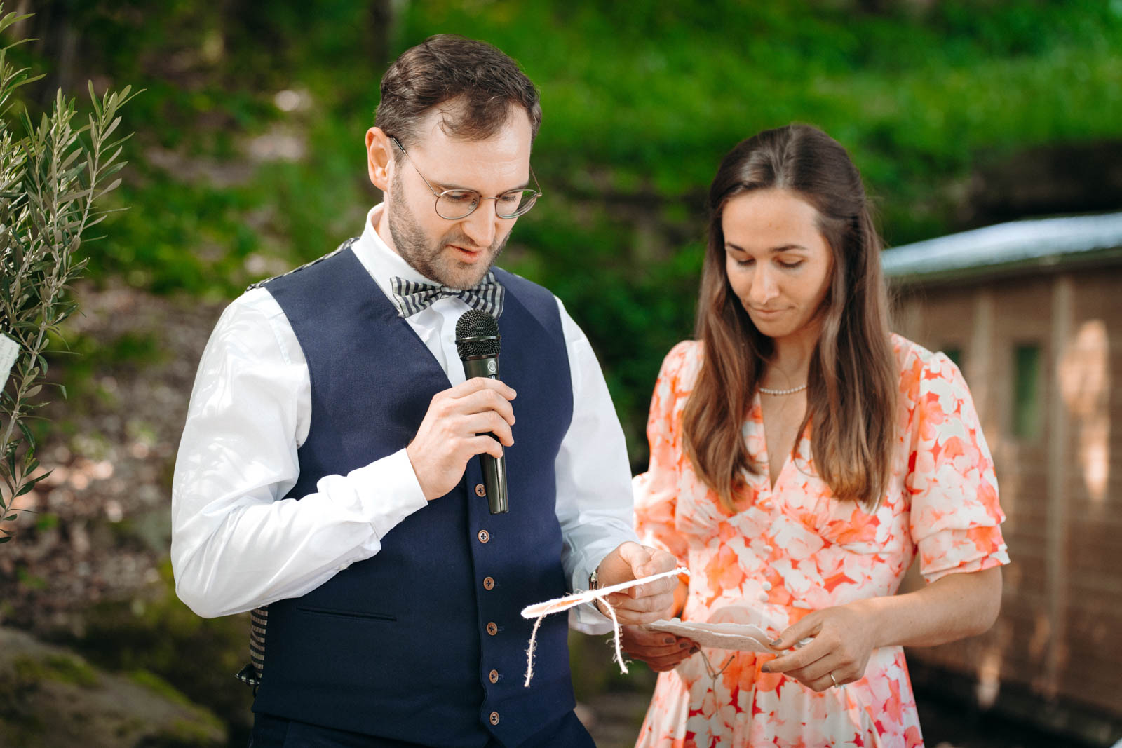 Das Highlight der Trauung von Selda und Konstantin war die Zeremonie, die unter dem großen Baum im Garten der Villa stattfand. Der majestätische Baum bot nicht nur eine malerische Kulisse, sondern symbolisierte auch Stärke, Beständigkeit und das tiefe Wurzelnschlagen, das Selda und Konstantin in ihrer Beziehung verbinden wollte. Der Baum, umgeben von üppigem Grün und blühenden Wiesen, verlieh der Trauung einen besonders magischen Touch. Die Atmosphäre war ruhig, naturverbunden und voller Bedeutung. Umgeben von Familie und Freunden sprachen Selda und Konstantin hier ihre Eheversprechen und gaben sich das Ja-Wort – ein Moment voller Emotionen und Liebe, den die Hochzeitsfotografin perfekt einfangen konnte.