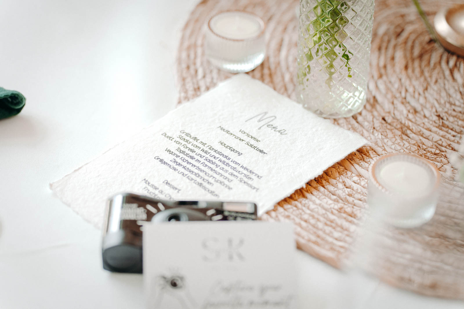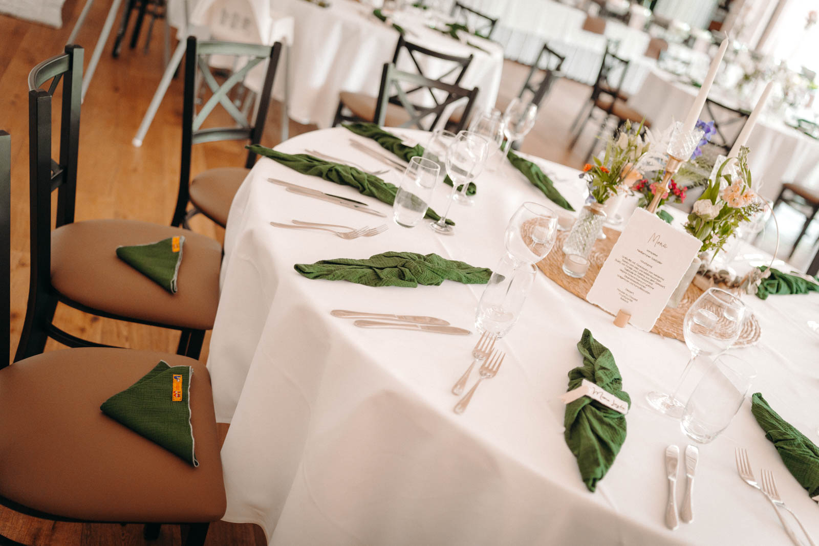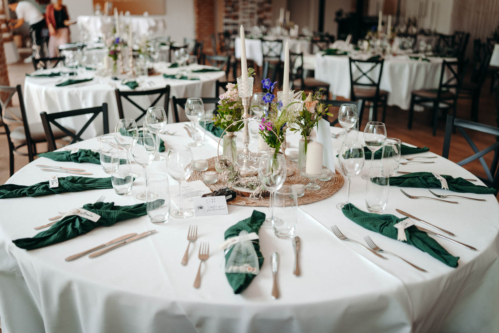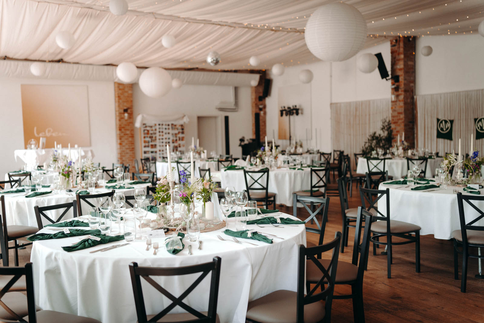 Nach der emotionalen Trauung versammelten sich alle Gäste im Außenbereich der Villa, um mit dem Brautpaar zu feiern. Die Villa Hof Langenborn ist bekannt für ihre stilvolle und gleichzeitig entspannte Atmosphäre, die sich perfekt für Hochzeitsfeiern im Freien eignet. Selda und Konstantin haben die Location mit einer schlichten, aber eleganten Dekoration in warmen Naturtönen gestaltet, die perfekt mit der Umgebung harmonierte. Die Tische waren mit weißen Blumen und zarten Lichtern geschmückt, was dem Ganzen eine sanfte, romantische Note verlieh. Die offene und lockere Atmosphäre ermöglichte es den Gästen, sich frei zu bewegen und die Schönheit der Natur zu genießen, während sie gemeinsam diesen besonderen Tag feierten.