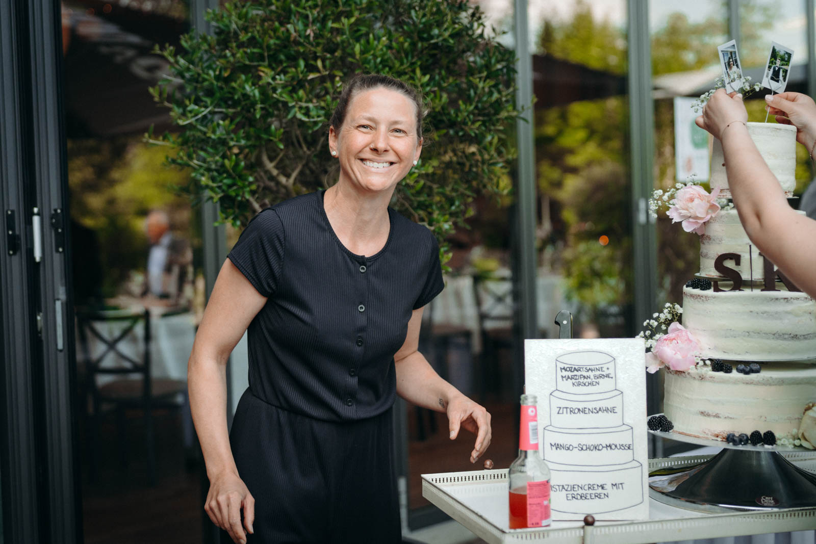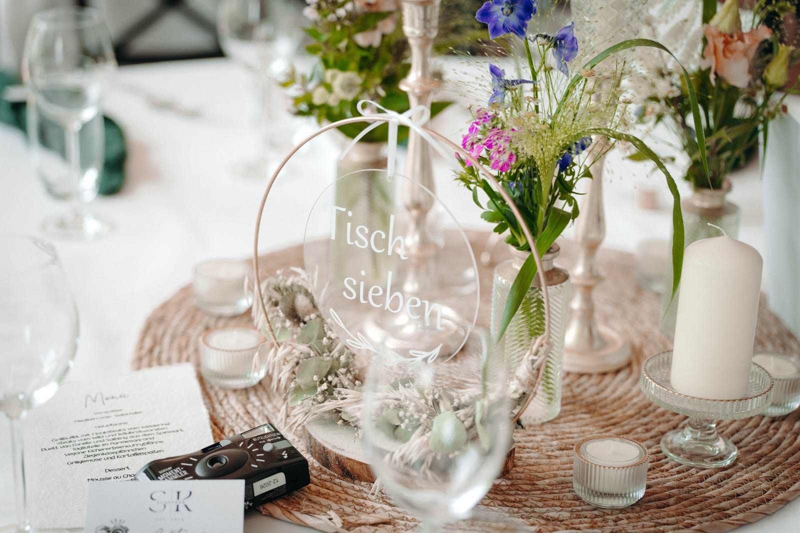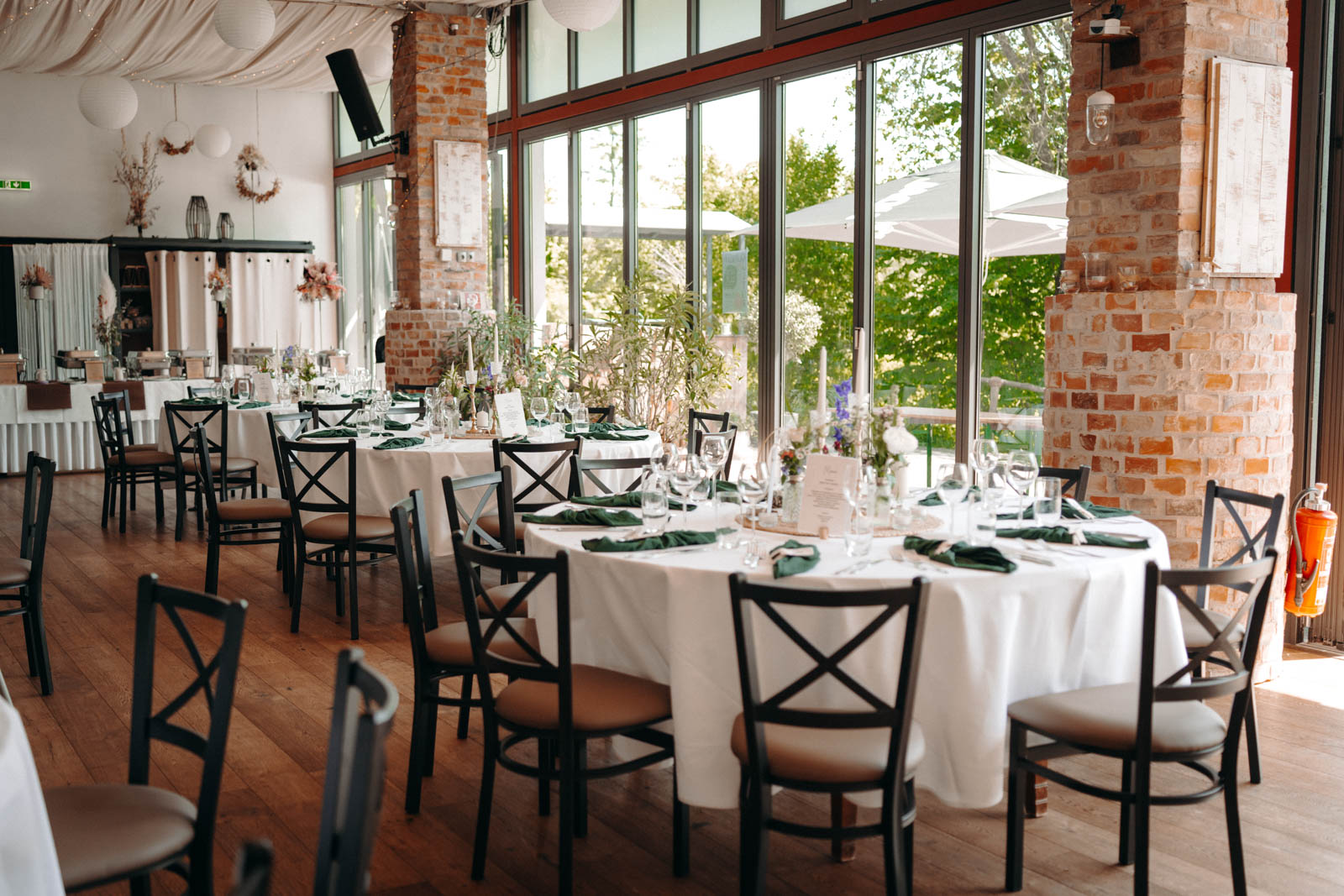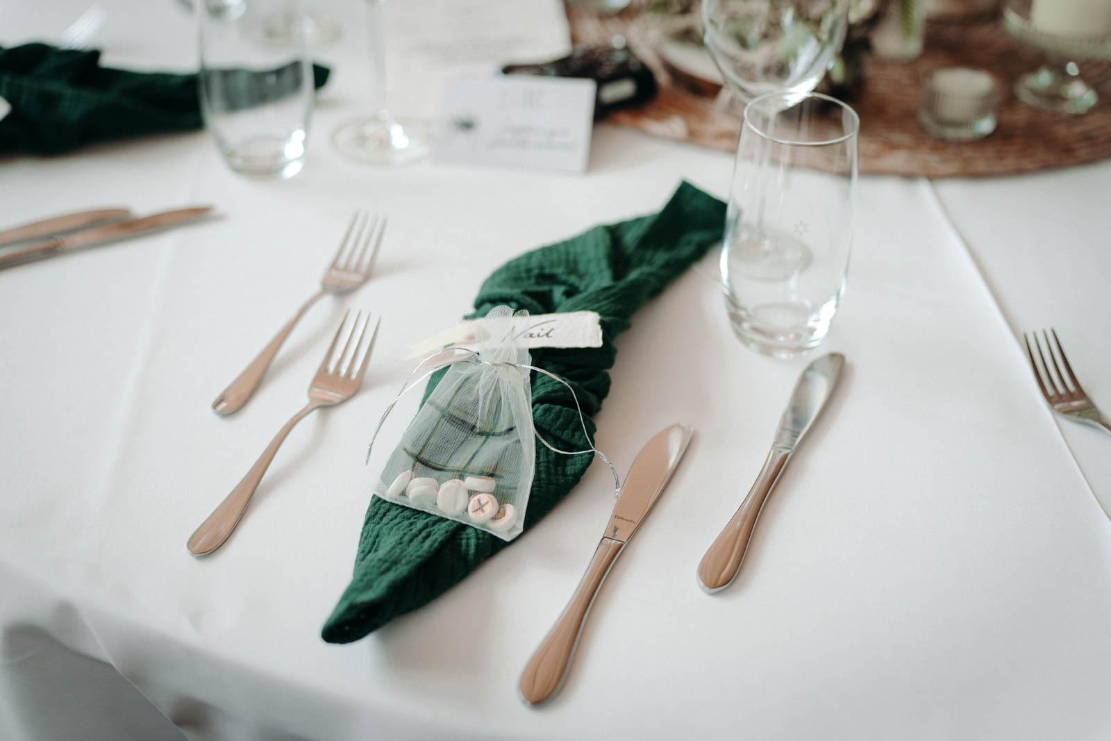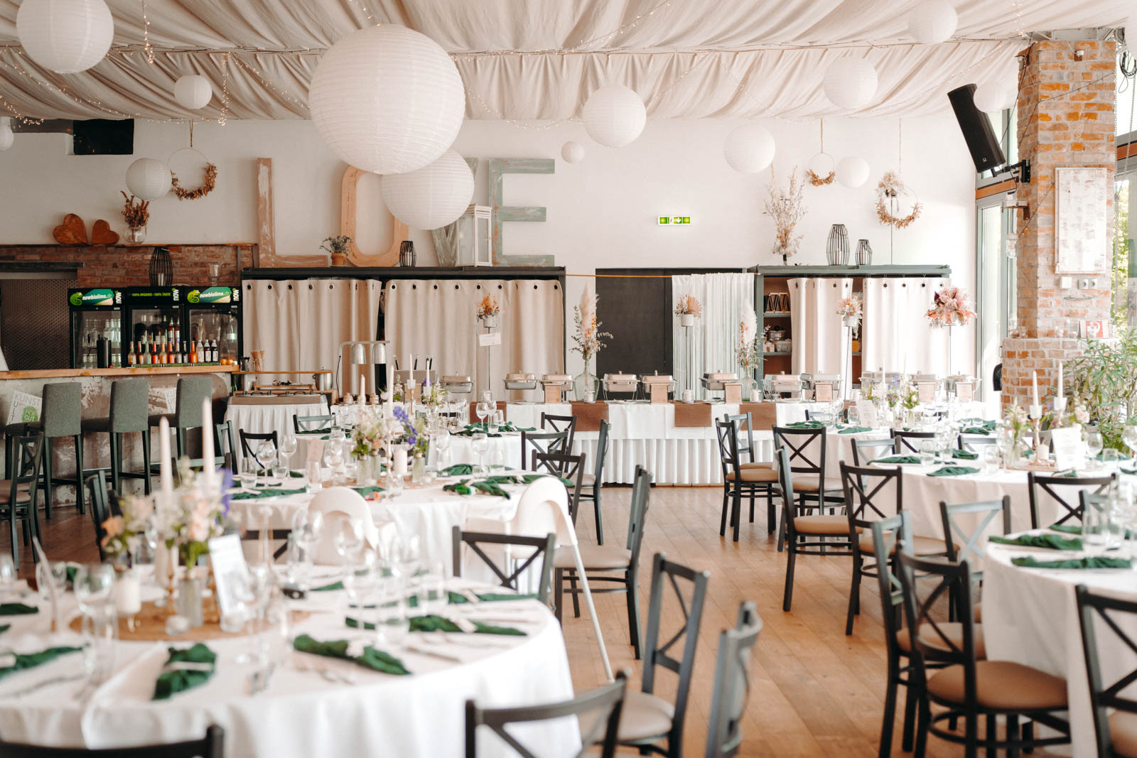 Nach der emotionalen Trauung versammelten sich alle Gäste im Außenbereich der Villa, um mit dem Brautpaar zu feiern. Die Villa Hof Langenborn ist bekannt für ihre stilvolle und gleichzeitig entspannte Atmosphäre, die sich perfekt für Hochzeitsfeiern im Freien eignet. Selda und Konstantin haben die Location mit einer schlichten, aber eleganten Dekoration in warmen Naturtönen gestaltet, die perfekt mit der Umgebung harmonierte. Die Tische waren mit weißen Blumen und zarten Lichtern geschmückt, was dem Ganzen eine sanfte, romantische Note verlieh. Die offene und lockere Atmosphäre ermöglichte es den Gästen, sich frei zu bewegen und die Schönheit der Natur zu genießen, während sie gemeinsam diesen besonderen Tag feierten.